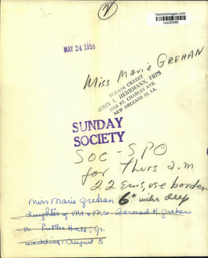 Miss Marie Grehan, daughter of Mr. and Mrs. Bernard H. Gretna to Luther Hall, Jr. Wedding: August 5