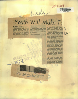 Head-shakers and hand-wringers worried about the state of the world with its Watergate, sex scandals, wars, inflation, unemployment, pollution, energy crises- take heart, "Today's youth, that much maligned generation, will make tomorrow's world safe for humanity." Lady Janner, O.B.E., J.P. (Order of the British Empire, Justice of the Peace) of London.