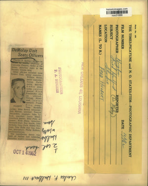 Charles F. Hulbert, III was installed as master councilor of Concorde Chapter, Order of DeMolay, Saturday night in the Masonic temple building. Other officers installed were Robert Paul, senior councilor; William Welch, junior councilor; Earnie Cortie, senior deacon; Eddie Abernathy, junior deacon; Fred Fassbender senior stewards; Tommy Bitterwolf, junior steward; Frank Piro, orator; Tony Marzilli, scribe; Mike Brown treasurer; Bob Bowser, sentinel; Tommy McLendon, chaplain; John Tylock, marshal.
