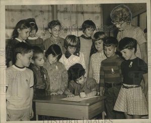 Students At Edwayrd Hynes School watch their classmate, Isabel Rosenfeld, a second-grader, sign a proclamation promising to participate in an anti-litter campaign. Supervising the procedure is their teacher, Miss Olga Gonthier. Hynes won an award in last year's campaign for showing the greatest improvement in cleanliness.
