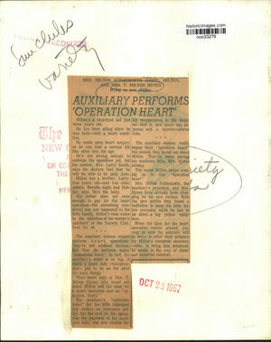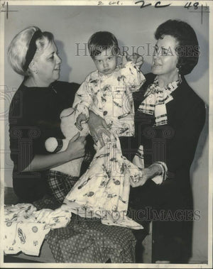Mrs. Milton Aufdemorte (left), Milton, and Mrs. T. Milton Hynes trying new clothes. Milton's a blue-eyed lad just three years old. He has been ailing since he was born- with a heart condition. He needs open heart surgery so he can lead a normal life like other tots his age. Women's Auxiliary of the Variety Club, Trent No. 45