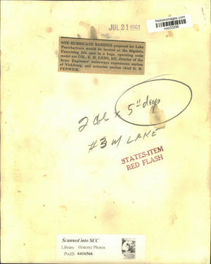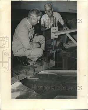 One hurricane barrier proposed for Lake Pontchartrain would be located at the Rigolets. Examining this spot in a huge, operating scale model are Colonel E.H. Lang, left, director of the Army Engineers' waterways experiment station at Vicksburg, and estuaries section chief G.B. Fenwick.