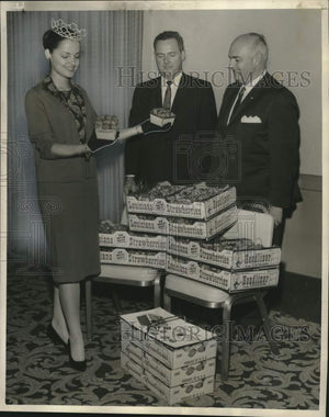 The president of Louisiana strawberries are held for admiration by Joan M'Clellan, Louisiana's strawberry queen. Admires of both queen and berries are from left, O.B. Harrell, Hammond, and Joseph W. Simon Junior, New Orleans.