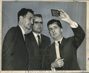 Studying a slide at a meeting of the Louisiana Society for Electron Microscopy at the Royal Orleans Hotel are, from left, Claude J. Arceneaux, Baton Rouge; Dr. Robert H. Morriss, Tulane University, and Dr. Erwin Eichen, Dearborn, Michigan.