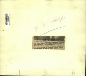 Leaving Hollywood Presbyterian Hospital Wednesday after throat surgery, Senator George Murphy, Republican, replies in writing as a newsman asked him how he felt. The 62-year-old former actor plans to recuperate at home for 10 days before returning to Washington. Doctors removed a malignant tumor and said the surgery appeared successful.