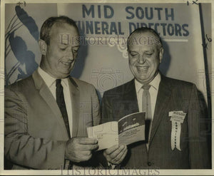 Ralph S. Tuner, left, district governor of the National Funeral Directors' Association, chats with Milton Rambo, manager of Lamana-Panno-Fallo Funeral Home in New Orleans, prior to today's meeting at the Mid-South Funeral Directors' Convention. --- Salesmen who earn a living by soliciting business for funeral homes in advance of death have caused a justified public outcry, an official of the National Funeral Director's Association said in New Orleans today. Ralph S. Turner, Decatur, Georgia, district governor of the NFDA, is here for the Mid-South Funeral Directors Convention at the Jung Hotel through tomorrow.