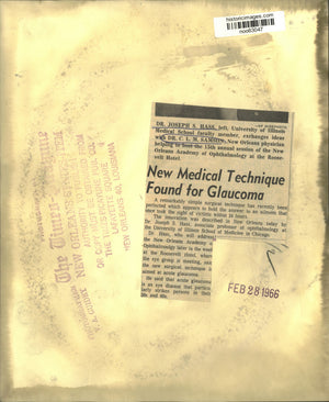 A remarkably simple surgical technique has recently been perfected which appears to hold the answer to an ailment that once took the sight of victims within 24 hours. The innovation was described in New Orleans today by Dr. Joseph S. Hass, associate professor of ophthalmology at the University of Illinois School of Medicine in Chicago. Dr. Joseph S. Hass, left, University of Illinois Medical School faculty member, exchanges ideas with Dr. C.L.M. Samson, New Orleans physician helping to host the 15th annual session of the New Orleans Academy of Ophthalmology at the Roosevelt Hotel.