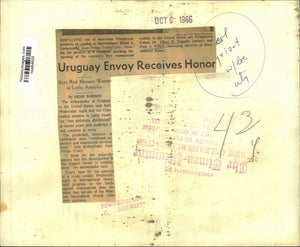 The ambassador of Uruguay to the United States said here Wednesday night that the Communist menace to Latin America "has definitely diminished" in recent years and predicted it will continue to wane. The prediction, however, is contingent upon "continued economic and educational development," said Ambassador Juan Felipe Yriart. Displaying one of numerous Uruguayan products on exhibit at International House is Ambassador Juan Felipe Yriart (left). Viewing the product at a reception marking the opening of the country's first commercial exhibit in the United States are Uruguayan Consul Dr. Albert D. Fajardo (center) and Paul A. Fabry, managing director of International House.