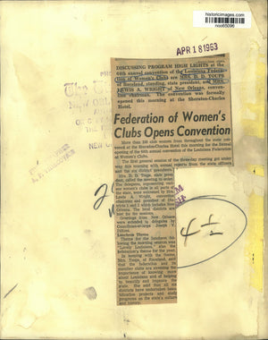 Discussing program highlights at the 64th annual convention of the Louisiana Federation Of Women's Clubs are Mrs. D. D. Toups of Raceland, standing, state president, and Mrs. Lewis A. Wright of New Orleans, convention chairman. The convention was formally opened this morning at the Sheraton-Charles Hotel.