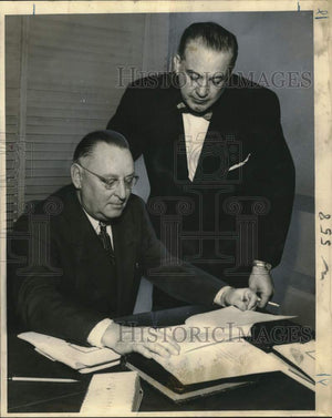 Looking over one of the 25 applications for ad valorem tax exception received today by the state board of commerce and industry meeting at International House are Ernest D. Wilson, left, of Baton Rouge, chairman of the board, and Elmer D. Conner, executive director of the state department of commerce and industry.