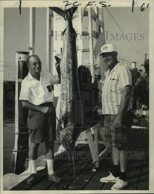 E. L. Van Every, right, Jackson, Mississippi, is shown with weightmaster Marion Higgins checking in his rodeo record-breaking sailfish. The 67 1/2 pound sailfish caught Thursday in the Empire-South Pass Tarpon Rodeo broke the record of 62 pounds set in 1965 by Bill Winn of Baton Rouge.