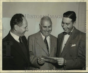 Two checks totaling $1700 are presented to Sol Shnaider, right, president of B'nai B'rith State Association of Louisiana for B'nai B'rith Philanthropies and Services by Joseph Cahn, left, executive secretary of District Grand Lodge No. 7, and Camille Weis, center, treasurer of the group's New Orleans council. The funds, given by New Orleans Lodge No. 182 and the Archibald A. Marx Lodge No. 1769 of B'nai B'rith, was raised by an auction at O'Dwyer's.