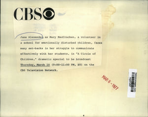 Jane Alexander, as Mary MacCracken, a volunteer in a school for emotionally disturbed children, faces many setbacks in her struggle to communicate effectively with her students, in "A Circle of Children," dramatic special on the CBS Television Network.