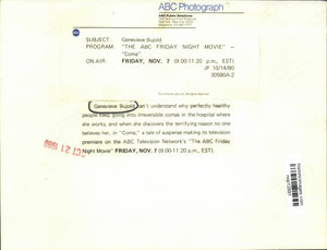 Genevieve Bujold can't understand why perfectly healthy people keep going into irreversible comas in the hospital where she works, and when she discovers the terrifying reason no one believes her, in "Coma," a tale of suspense making its television premiere on the ABC Television Network's "The ABC Friday Night Movie" Friday, Nov. 7 (9:00-11:20 p.m., EST).