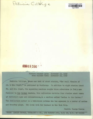Patricia Collinge, whose new book of short stories, "The Small Mosaics of Mr. & Mrs. Englel," is published by Doubleday. In addition to eight stories about Mr. & Mrs. Engel, the appealing American couple whose adventures in Italy are familiar to New Yorker readers, this collection contains four stories about women of different ages and circumstances, in a section called "Ladies to the Center." The Dublin-born author is a well-known actress who has appeared in a number of movies and Broadway plays. She lives with her husband in New York City.
