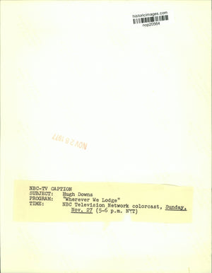Hugh Downs, "Where We Lodge" NBC Television Network colorcast, Sunday, November 27 (5-6 p.m. NYT)