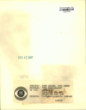 John Archer, Toni Gerry, "The Millionaire," Wednesday 9:00-9:30 PM, EST (Starting January 19). Sponsored by Colgate-Palmolive Company