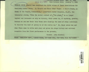 Michael Meyer (above) has completed his fifth volume of Ibsen translations for Doubleday Anchor Books. In "Ghosts and Three Other Plays: A Doll's House, An Enemy of the People, Rosmersholm," the translator states, "When the social content of (the plays) is no longer topical and interests us only as history, their power is, if anything, greater, because we can see their true theme more clearly; the need of every individual to discover the kind of person he or she really is." Mr. Meyer shows how and when Ibsen came to write each play and gives its stage history and critical reception from the first performance to the present.