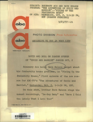 David and Doll on season opener of "Ozzie and Harriet" series October 2. Rosemary Ace helps Dave Nelson forget about his fraternity house problems, in "Fixing Up the Fraternity House," first episode of the new season for ABC-TV's "The Adventures of Ozzie and Harriet," Wednesday, October 2. On this show, brother Rick Nelson sings his newest recordings, "Be-Bop Baby" and "Have I Told You Lately That I Love You?"