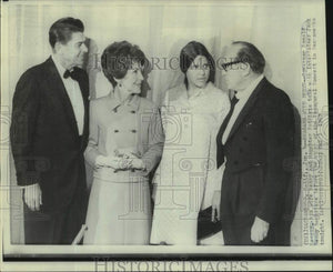 Governor Ronald Reagan, his wife Nancy and daughter Patricia talk with entertainer Jack Benny backstage before the start of the Inaugural Concert in Sacramento tonight.