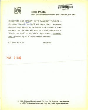 Christine and Harry have Concert Tickets--Christine (Markie Post, left) and Harry (Harry Anderson) show off their tickets to the hottest rock concert in town unaware that the star will soon be in their courtroom in "Up On The Roof" on NBC-TV's "Night Court". Thursday, May 15 (9:30-10 p.m. NYT; in stereo).