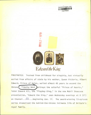 Frustrated: Trained from childhood for kingship, but virtually exiled from affairs of state by his mother, Queen Victoria, Albert Edward, Prince of Wajes, waited almost 40 years to ascend the throne. Timothy West portrays the colorful "Prince of Hearts," later Edward VII, the "Playboy King," in the new Mobil Showcase presentation, "Edward the King," seen Wednesday evenings at 8 (ET) on Channel 26, beginning Jan. 17. The award-winning 13-episode series dramatized the behind-the-throne intimate life of Britain's royal family.