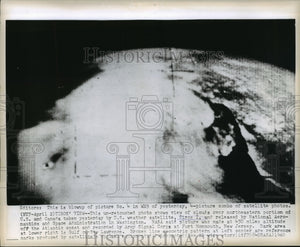 This un-retouched photo shows view of clouds over northeastern portion of US and Canada taken yesterday by U.S. Weather satellite, Tiros I, and released by National Aeronautics and Space Administration in Washington. NASA said picture was made at 450 miles altitude off the Atlantic coast and recorded by Army Signal Corps at Fort Monmouth, New Jersey. Dark area at lower right is Gulf of St. Lawrence. Broken line geometric pattern at left center are reference marks produced by satellite's orbital equipment.