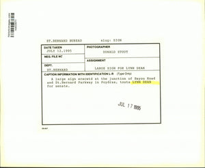 1995 Press Photo A large sign erected for Lynn Dean for senate in St. Bernard