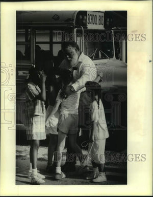 1988 Press Photo Public school bus driver gets big hug from some of his riders