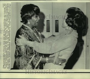 First Lady Betty Ford is embraced by singer Pearl Bailey at the Kennedy Center in Washington Tuesday night. Mrs. Ford, who is 57-years-old today, celebrated her birthday by attending the singer's performance at the center.