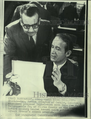 Rep. Robert Edington of Mobile, (seated), discusses proposed legislation with Rep. Joe C. McCorquedale, Jr. of Clarke County as the legislature appears headed toward quick action of the Albert Brewer's school program.