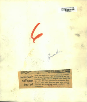 More than half of the concrete top of an earth-fill dam at the Norman Lakes Reservoir in the San Fernando Valley of Los Angeles lies broken in the water following yesterday's earthquake. People in a wide area below the dam were ordered evacuated as authorities feared a collapse.