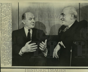 Secretary of State Dean Rusk talks with Amintore Fanfani, right, Italian Prime Minister and current president of the United Nations General Assembly. Fanfani came to Washington today after the U.N. General Assembly wound up its business and was in conference with Rusk for three hours, but there was no official word on the subject of their conversations. Fanfani told newsmen after the meeting only that Rusk had thanked him for his role in transmitting to President Johnson an alleged North Vietnamese peace feeler.