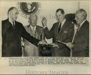 Two Defense Department Officials are sworn in at the White House today in a dual ceremony as they move up to new posts. Taking the oath as the new Secretary of the Navy is William B. Franke, left, while Thomas S. Gates, Jr., second from right, becomes Deputy Secretary of Defense. President Eisenhower attends the ceremony as White House Administrative Officer Frank Sanderson reads the oath.