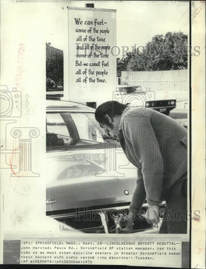 1973 Press Photo Springfield, MA gas station Lincolnsque boycott rebuttal
