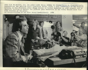 David M. Fishlow, left, representing the American Civil Liberties Union, holds a news conference in the Federal Building in San Francisco after Judge Oliver J. Carter rejected an ACLU request for an immediate hearing on whether the private jury selection in the Patty Hearst case violates freedom of press.
