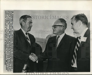 Arizona's Senator Barry Goldwater, Republican presidential nominee, is welcomed by Pennsylvania's Governor William Scranton on arrival at Hershey, PA airport today for top level strategy conference with nation's Republican governors and gubernatorial candidates. At right is GOP national committee chairman R. Dean Burch.