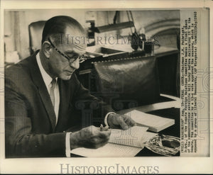 Chairman J.W. Fulbright, D-AR, of the Senate Foreign Relations Committee makes a final check of the communications satellite bill today before delivering it to the Senate. The committee by a 13-4 vote approved the measure, which is opposed by a group of liberal Democrats.