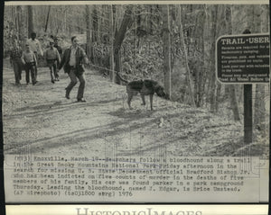 1976 Press Photo Searchers follow bloodhound, J. Edgar, in Great Smokey Mtns.