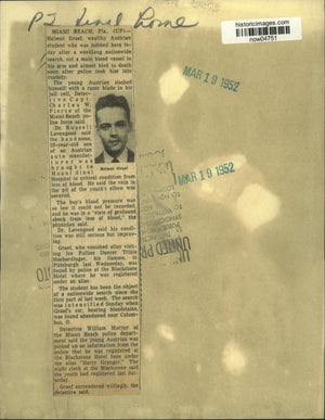 Helmut Graef, wealthy Austrian student who was nabbed here today after a week-long nationwide search, cut a main blood vessel in his arm and almost bled to death soon after police took him into custody. The young Austrian slashed himself with a razor blade in his jail cell, Detective Captain Charles W. Pierce of the Miami Beach police force said. The mysterious disappearance of an Austrian student at the University of Cincinnati whose blood stained auto was found near Columbus was being investigated by police there. The 1941 model car belonged to Helmut Graef, 23, ,,,,mechanical engineering student. Graef has been missing science March 7.