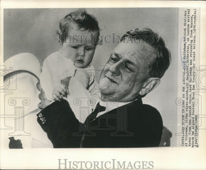 Lord Hailsham, British Minister of Science, lifts a eight-month-old daughter, Katherine, on London arrival today from the Soviet Union. Lord Hailsham was returning from Moscow, where he signed Nuclear Test Ban Treaty for Great Britain.