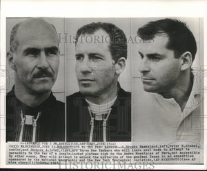 C. Brooks Backeland, left, Peter R. Gimbel, center, and Jacques A. Istel, right, are three New Yorkers who will leave next week to attempt to parachute to the top of a jungle-locked plateau high in the Andes Mountains of Peru, not accessible by other means. They will attempt to unlock the mysteries of the ancient Incas in an expedition sponsored by the National Geographic and the New York Zoological Societies.