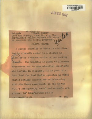 A simple handbill on diets is distributing by a health worker in a village in Ghana after a demonstration of new cooking methods. The handbill is given to literate housewives and to mass education assistants who lecture in villages. It is part of a Good Food for Good Health campaign in which United Nations experts are collaborating with the Ghana government, in one of the U.N.'s fast-growing social and economic programs.