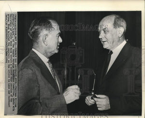 Chairman William Fulbright (D-AR), of the Senate Foreign Relations Committee, chats with Secretary of State Dean Rusk before a closed door session of the group. Rusk briefed the senators on the crisis in Laos and Southeast Asia.
