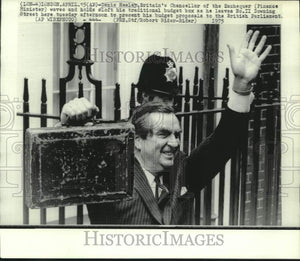 Denis Healey, Britain's Chancellor of the Exchequer (Finance Minister) waves and holds aloft his traditional budget box as he leaves No. II Downing Street here Tuesday afternoon to present his budget proposals to the British Parliament.