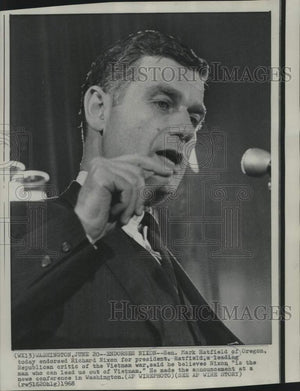 Senator Mark Hatfield of Oregon, today endorsed Richard Nixon for president. Hatfield, a leading Republican critic of the Vietnam war, said he believes Nixon "is the man could lead us out of Vietnam." He made the announcement at a news conference in Washington.
