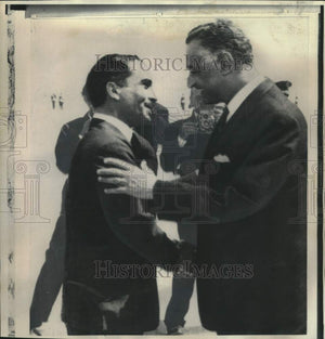 United Arab Republic President Gamal Abdel Nasser (right) greets Jordan's King Hussein with a handshake and a pat on the arm at Cairo airport Sunday. Hussein arrived for two days of talks with Nasser on the latest developments in the Middle East crisis.