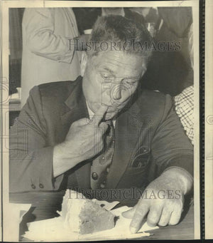 1974 Press Photo James R. Hoffa taste prison cake in Norfolk, Massachusetts