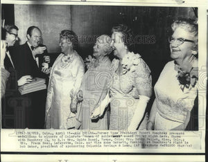 Former Vice President Hubert Humphrey presents medallions to winners of Colorado "Women of Achievement" award Friday night here. Shown with Humphrey (L to R): Mrs. Guido Rossi, Yampa, Colorado; Mrs. Betty Pellet, Rico, Colorado; Mrs. Frank Neal, Lafayette, Colorado and Miss Anna Garnett, Pueblo. At Humphrey's right is Bob Baker, President of sponsoring Columbia Savings & Loan.