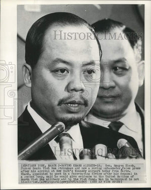 Lt. General Nguyen Khanh, former South Vietnam strongman and now a roving ambassador, faces press after his arrival at New York's Kennedy Airport from Paris. Khanh, appointed to post in a face-saving device after his disposal in a recent coup, said he would give evidence to the United Nations of North Vietnam Nam military aid to the Viet Cong. Man in background is not identified.